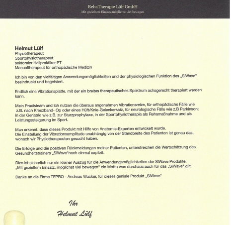 In unserer großzügigen Physiotherapie setzen wir seit 2012 mehrere SiWAVE Produkte sehr erfolgreich ein (SiWAVE Multi Basic, SiWAVE Multi Plus und Siwave Body Sport). Die Geräte werden ganztägig benutzt. Wir haben in der Therapie sehr gute Erfahrungen und sind auch von der Qualität der Produkte voll überzeugt. Speziell anhand der einzigartigen Schwingung, erzielt durch die exakte Sinuswelle, haben wir in der Therapie mehr und mehr Erfolge.